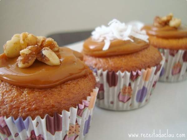 Depois de assar, com uma faca, faça um furo no meio de cada bolinho e coloque, com a ajuda do saco de confeteiro, o doce de leite. Enfeite com nozes.